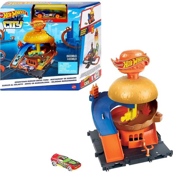 En la tienda de hamburguesas de Hot Wheels City, los niños pueden simular llevar y disfrutar deliciosas comidas. Con tan solo girar el cartel del logotipo, los vehículos Hot Wheels cobran vida y atraviesan el autoservicio en una divertida simulación. Cada detalle ingenioso del lugar mejora la inmersión en el juego, garantizando una experiencia llena de diversión y creatividad. Los niños pueden ejercer su imaginación mientras revisan el emocionante menú y operan la compuerta móvil con forma de espátula para dar paso a los veloces vehículos.El set incluye un vehículo Hot Wheels, lo que permite que la diversión comience de inmediato. Es el regalo ideal para niños a partir de 4 años, ya que les permite imaginar emocionantes aventuras o recrear divertidas historias.Observación:Los colores y las decoraciones pueden variar.