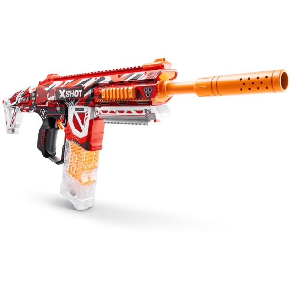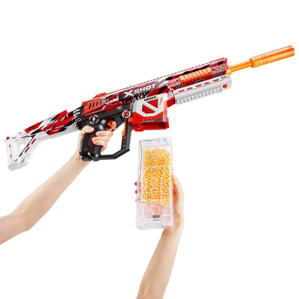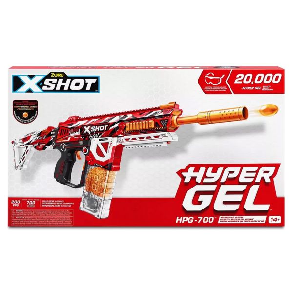 La pistola de juguete Zuru X-Shot Hypergel HPG-700 20,000 con balines de gel puede disparar balines a 61 metros por segundo con sus modos totalmente motorizados y semiautomáticos. El HPG-700 tiene un cargador con capacidad para 700 balines. Este Gel Blaster motorizado viene con una batería recargable y está equipado con 20,000 balines y gafas protectoras. Simplemente agregue agua a los balines para comenzar la batalla.