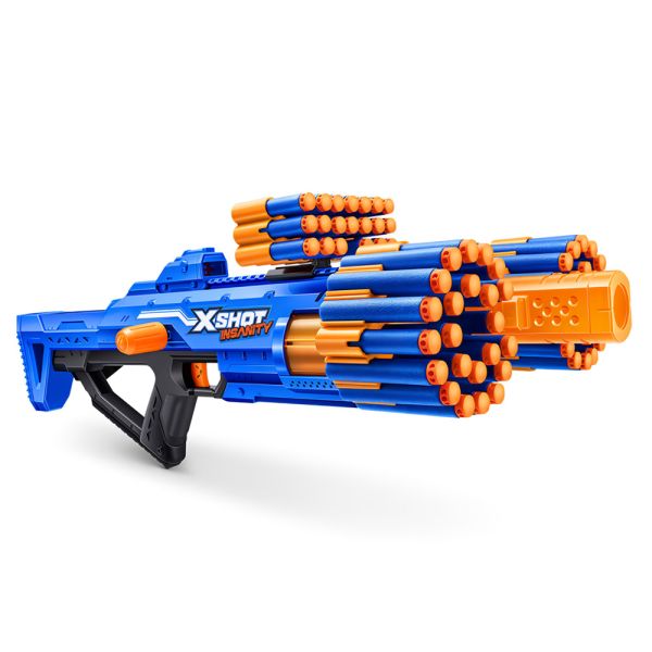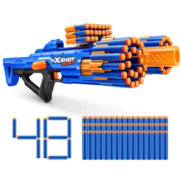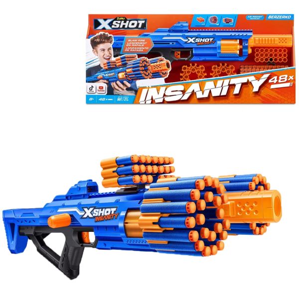 La pistola de juguete Zuru X-Shot Insanity Berzerko, con 48 dardos, cuenta con suficiente potencia para enfrentarse a objetivos a 27 metros de distancia, gracias a su disparo rápido de 8 dardos en segundos mediante el cañón giratorio. Presenta una increíble capacidad de almacenamiento para contener 66 balas adicionales, manteniéndote listo y cargado durante la batalla. Las balas X-Shot incorporan la tecnología Air Pocket para una explosión más rápida, más profunda y más precisa.