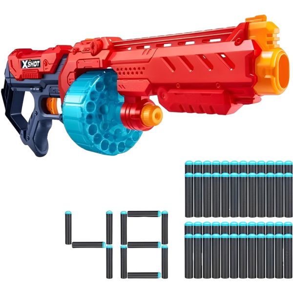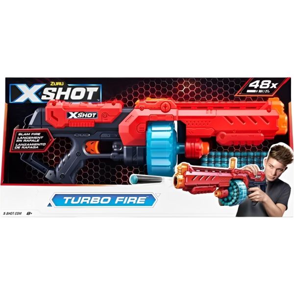 El X-Shot Turbo Fire combina potencia, velocidad y precisión en un solo blaster. Su cañón rotatorio automático permite disparar 20 dardos en segundos con la función Slam Fire, además de contar con una mira emergente para mejorar la puntería y alcanzar objetivos hasta 27 metros de distancia. Incluye 48 dardos con tecnología Air Pocket, diseñados para mayor velocidad y precisión. Con capacidad para 20 dardos en el tambor y 8 más en almacenamiento adicional, es ideal tanto para enfrentamientos cercanos como para disparos de largo alcance.