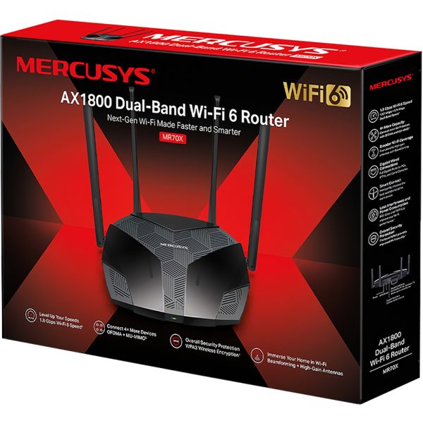 El router MR70X de Mercusys es un dispositivo de Wi-Fi 6 de doble banda AX1800 que alcanza una velocidad de conexión a Internet de hasta 1.8 Gbps, lo que garantiza una señal estable y sin cortes. Gracias a las tecnologías MU-MIMO y OFDMA, se reduce la congestión de la red y se multiplica por 4 el rendimiento, permitiendo que se conecten más dispositivos. El router cuenta con 4 antenas de alta ganancia y tecnología Beamforming para asegurar una cobertura de larga distancia y conexiones estables. Además, está equipado con el último estándar de seguridad WPA3, lo que garantiza una red segura para todos tus dispositivos. Con los puertos Gigabit, puedes conectar dispositivos como Smart TV o videoconsolas a máxima velocidad. La tecnología Target Wake Time (TWT) reduce el consumo de energía de tus dispositivos móviles e inteligentes, mientras que la tecnología BSS Color reduce la interferencia de las señales de los vecinos y mejora la eficiencia de la red. El router también cuenta con Smart Connect, que selecciona de forma inteligente la mejor banda disponible para cada dispositivo, optimizando la conexión y el rendimiento. Por último, el modo de punto de acceso permite ampliar una red por cable y convertirla en inalámbrica. Con el MR70X de Mercusys, disfrutarás de una experiencia de Wi-Fi 6 de alta calidad y un rendimiento óptimo.
