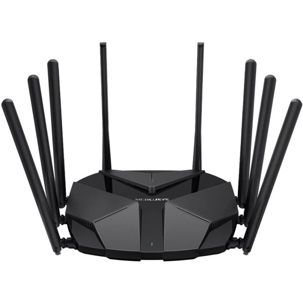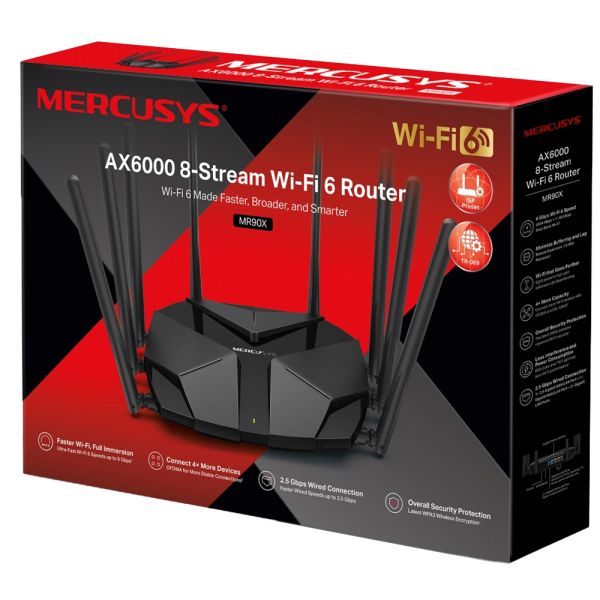 El router Mercusys MR90X AX6000 Wifi 6 Dual Band tiene un diseño compacto perfecto para aquellos que buscan una conexión de alta velocidad y un rendimiento excepcional. Wifi óptimo de 6 velocidades que alcanzan hasta 6 Gbps para una navegación, transmisión y descarga más rápidas, todo al mismo tiempo. Admite 4×4 MU-MIMO y OFDMA para reducir la congestión y cuadriplicar el rendimiento promedio. Cuenta con 8 antenas multidireccionales de alta ganancia con Beamforming aumentan las conexiones estables en toda tu casa para obtener fuertes señales Wifi en cada rincón. También presenta protección de seguridad general, el último WPA3 proporciona seguridad Wifi mejorada, minimiza la interferencia de señales vecinas para mejorar la eficiencia de transmisión con coloración BSS Su tecnología de última generación permite alcanzar velocidades de hasta 6Gbps, ideal para el streaming 4K, juegos en línea y transferencia de archivos de gran tamaño. Además, gracias a su compatibilidad con Wifi 6, disfrutarás de una conexión más rápida y estable, incluso en entornos con muchos dispositivos conectados.Características:Estándares inalámbricos: Compatible con los estándares Wi-Fi 802.11ax/ac/a/b/g/n.Velocidades WiFi: 4804 Mbps (5 GHz) + 1148 Mbps (2,4 GHz).Sensibilidad de recepción:11g 6Mbps: -97dBm11g 54Mbps: -79dBm11n HT40 MCS7:-74dBm 11nHT20 MCS7:-77dBm11a 6Mbps : -97dBm 11a54Mbps : -79dBm 11ac VHT20MCS8:-75dBm11ac VHT40 MCS 9:-71dBm11ac VHT80 MCS9:-67dBm11ax VHT20 MCS11:-67dBm11ax VHT40 MCS11:-64dBm11ax VHT80 MCS11:-61dBmPoder de transmision:2,4 GHz < 20 dBm (PIRE)5 GHz < 23 dBm (banda 1, banda 2)5 GHz < 30 dBm (banda 3)Seguridad inalámbrica: WPA/WPA2-Personal, WPA2/WPA3-Personal.Funciones inalámbricas: Activar/desactivar radio inalámbrica, WMM.SoftwareTipo de WAN IP dinámica/IP estática/PPPoE/L2TP/PPTP.Servidor VP: OpenVPN, compatible con PPTP.Interfaces: 1 puerto WAN/LAN de 2,5 Gbps + 1 puerto WAN/LAN Gigabit + 2 puertos LAN Gigabit.Tipo de antena: 8 × antenas omnidireccionales fijas.