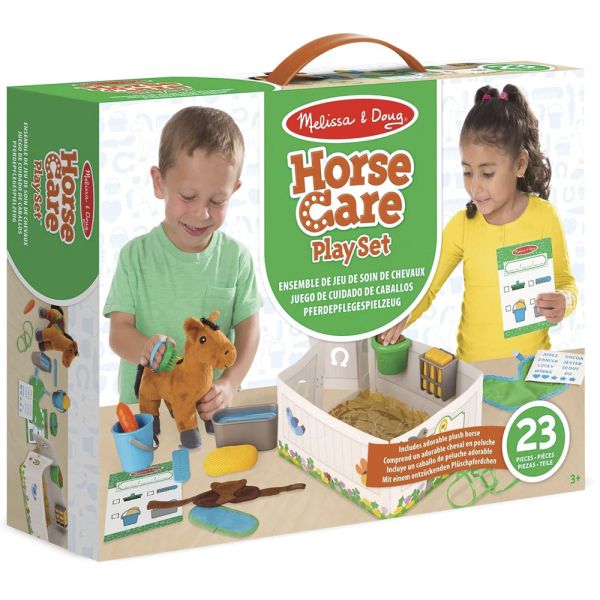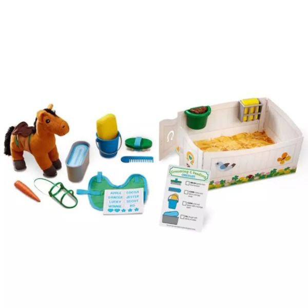 Juego con caballo de peluche y accesorios de alimentación y aseo. Incluye herraduras, cepillo, peine, cubo de lavado, esponja, grano, heno, contenedor de pellets, recipiente para heno, bebedero, inserto de agua de doble cara, mantilla, silla de montar, brida, manta para caballos, pegatinas con nombres. Lista de verificación reutilizable de doble cara para realizar un seguimiento de las responsabilidades del cuidado de los caballos Utilice el establo portátil de cartulina para caballos como un hogar acogedor para el caballo, luego guarde todas las piezas dentro.