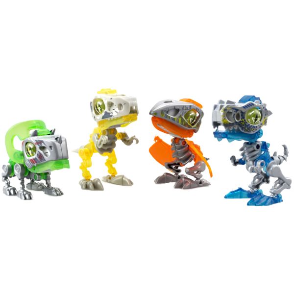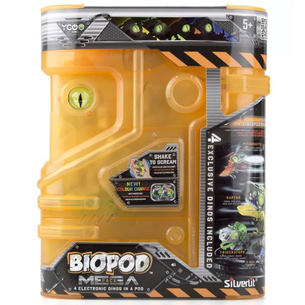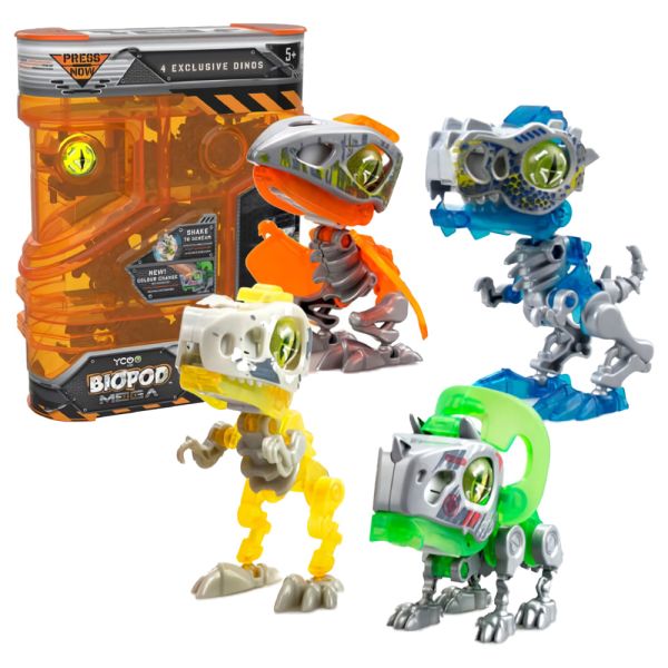 El Mega Pack de Biopod ofrece un emocionante juego de batalla de dinosaurios para niños. Con 4 dinosaurios electrónicos que emiten sonidos y luces al agitarlos, la creatividad, imaginación y habilidad son esenciales para ganar la batalla. Las piezas para construir son transparentes, e incluye los siguientes dinosaurios: Raptor, Tiranosaurio-Rex, Terodáctilo y Triceraptor.