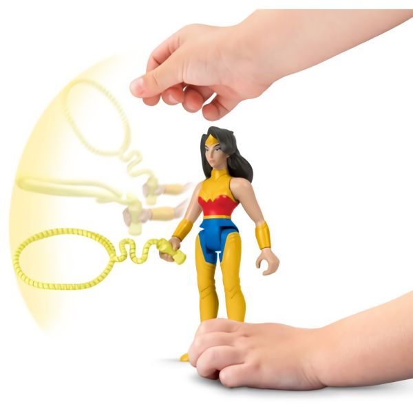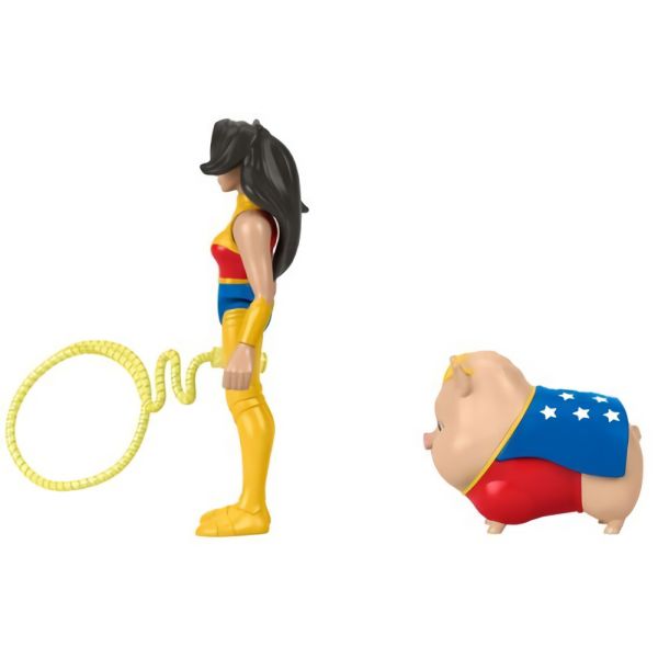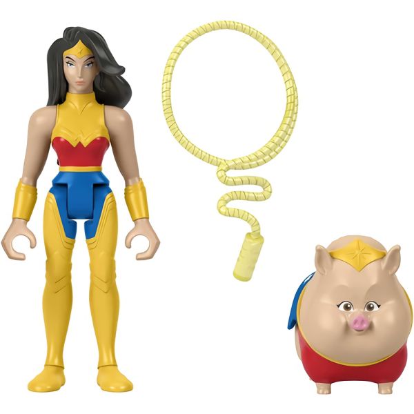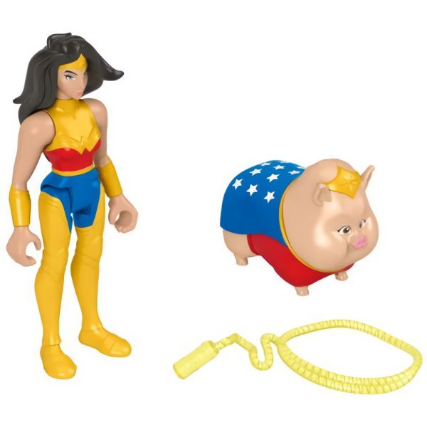 El set de muñeca presenta a Wonder Woman (Mujer Maravilla), PB su cerdito mascota, y un accesorio de lazo. El principal punto del juego consiste en tirar hacia atrás y soltar el brazo de la figura para ver a Wonder Woman "lanzar" su lazo. La muñeca mide 6 pulgadas de alto con brazos y piernas móviles para una acción realista, mientras que PB mide 4 pulgadas de alto con cabeza móvil. Es ideal para ratos de diversión y entretenimiento de manera segura.