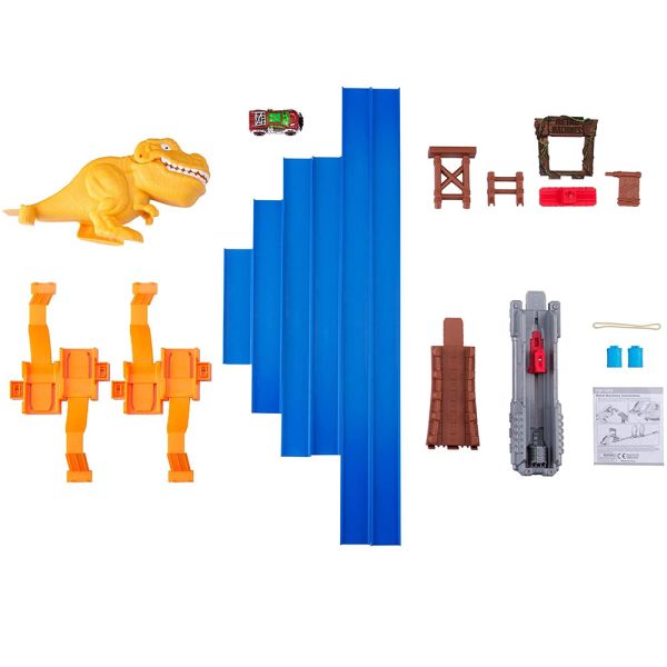 Incluye: 1 lanzador potente, 1 pista de carreras que incluye dos bucles de 360°, rampa de acrobacias, 1 T-Rex