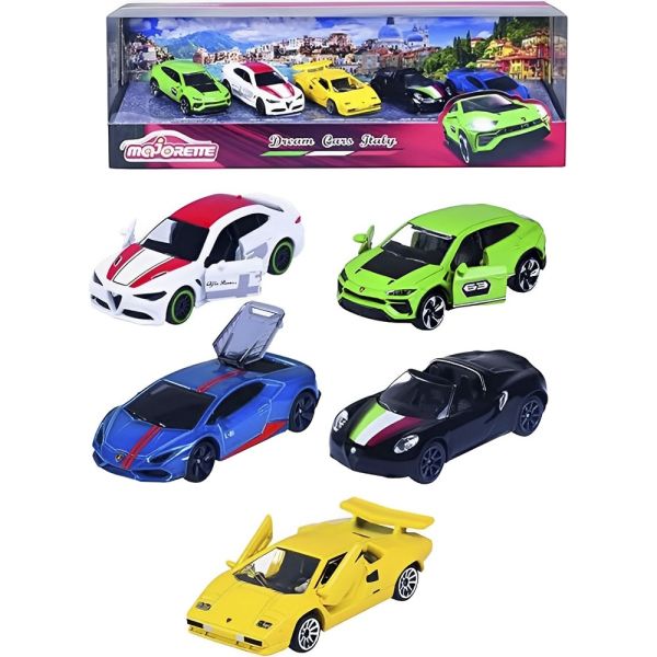 El Set de Vehículos Majorette Dream Cars Italy 5 piezas es una colección que rinde homenaje al diseño y la ingeniería automotriz italiana. Este conjunto incluye cinco modelos icónicos: Alfa Romeo 4C Spider, Lamborghini Countach LP 400, Lamborghini Huracán Avio, Lamborghini Urus y Alfa Romeo Giulia. Cada vehículo, a escala 1:64, mide aproximadamente 7.5 cm de largo y está fabricado en metal con detalles en plástico. Cuentan con ruedas giratorias, suspensión funcional y partes móviles, ofreciendo una experiencia de juego realista y estimulando la imaginación de los niños. Diseñado para niños a partir de 3 años, este set también es ideal para coleccionistas que buscan modelos detallados y con licencia oficial.