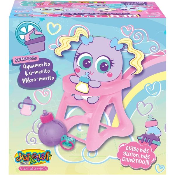 Sillita Distroller diseñada para ratos de entretenimiento, estimula la imaginación y creatividad en niños a partir de 3 años. Es un accesorio ideal para darle de comer al Neonato. Perfecta para Aquamerito, Ksi-merito y Mikro-merito. El set de 3 piezas incluye 1 sillita para comer, 1 chupete y 1 mamila. Observación: Imagen de referencia. No incluye la muñeca.