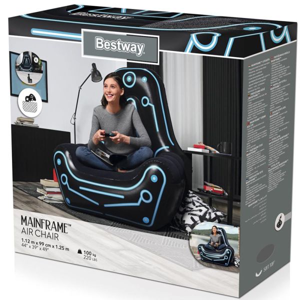 Con el sillón inflable Gamer Mainframe de Bestway está hecho para jugadores. Podrán jugar su videojuego favorito en éste sillon cómodo. Poséen un gran tamaño para descansar, el estampado con un diseño futurista que quedará genial en una sala de juegos o dormitorio.