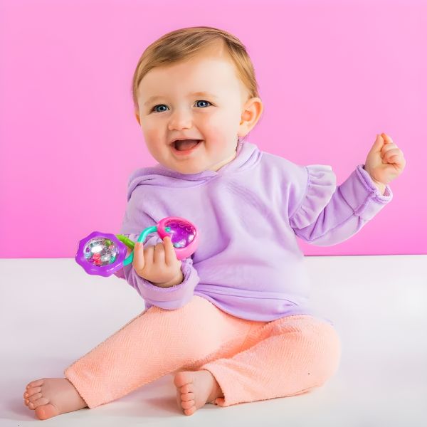 Este juguete para bebés con barra de Bright Starts presenta un diseño divertido y colorido, ideal para estimular los sentidos de la vista, oído y tacto de tu pequeño. Fabricado en plástico seguro, es perfecto para bebés de 3 meses en adelante. Este sonajero tiene un alegre diseño en rosa y morado, junto con un divertido mango retorcido que añade un toque encantador. Los mangos fáciles de agarrar y las cuentas sonajas proporcionan una experiencia táctil y auditiva estimulante para el bebé. Las superficies espejadas añaden un elemento visual fascinante. El mango texturizado facilita el agarre del bebé, contribuyendo al desarrollo de habilidades motoras. Este sonajero reflejado emite sonidos alegres y las cuentas de colores reflejan la luz, proporcionando una experiencia visual cautivadora. El sonajero promete diversión y sonrisas en cualquier momento y lugar.