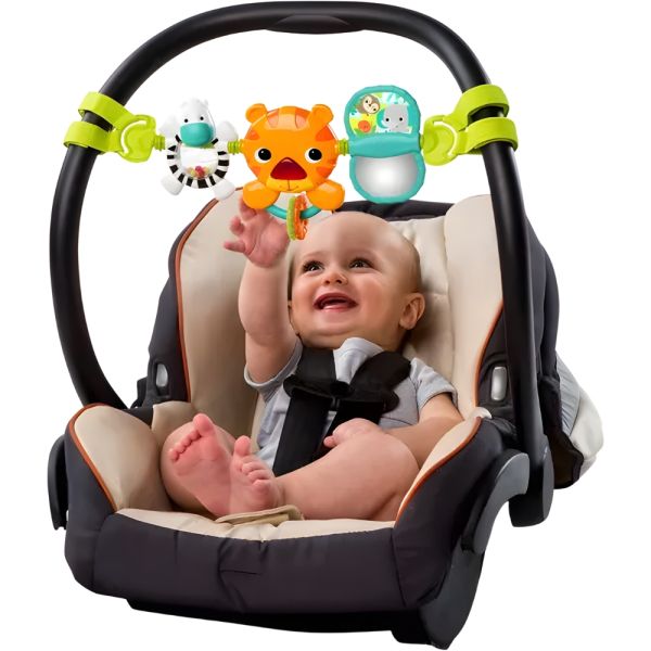 El sonajero colgante para carrito Bright Starts Take Along es un accesorio diseñado para hacer que los momentos en movimiento con tu bebé sean divertidos y estimulantes. Con un diseño alegre y colorido, este juguete está hecho de plástico duradero y es ideal para el desarrollo de las habilidades motoras de los bebés desde los 0 meses en adelante. Este sonajero colgante es perfecto para llevarlo durante recados o viajes, proporcionando entretenimiento para tu pequeño. Este juguete musical ofrece una variedad de actividades interactivas que fomentan el desarrollo de la motricidad fina. Tu bebé podrá tirar, agarrar y explorar diferentes elementos, contribuyendo a su crecimiento y aprendizaje. Observa a tu bebé disfrutar bateando y jugando con los amigos temáticos de la jungla que cuelgan de la barra. La bola giratoria de cebra con cuentas de cascabel, el espejo de paleta giratorio para el autodescubrimiento y el cazador de cuentas con anillos texturizados de colores ofrecen diversas actividades sensoriales. Además, la nariz del tigre se ilumina y reproduce cuatro melodías divertidas cuando el bebé la empuja, brindando estímulos visuales y auditivos. Este juguete para cochecito se sujeta fácilmente a la mayoría de los transportistas, lo que lo hace perfecto para salir a la calle. Incluso en entornos concurridos, este centro de actividades llamará la atención gracias a las luces y la actuación musical desencadenadas por toques y palmadas en la nariz del tigre. Disfruta de cada momento en movimiento con tu bebé mientras este sonajero colgante proporciona diversión y desarrollo.