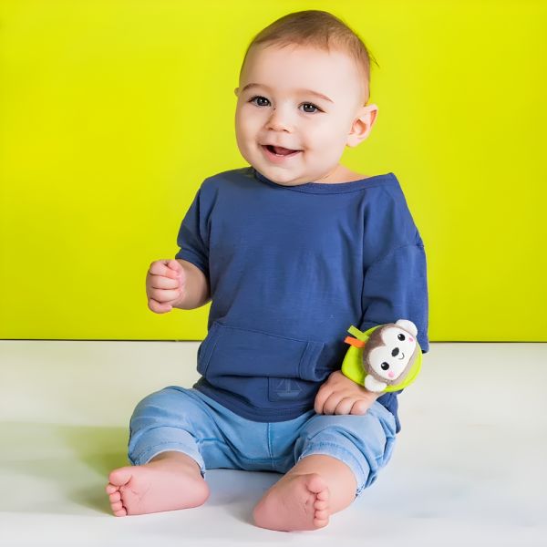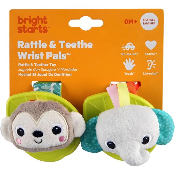 Introduce a tu bebé al mundo del entretenimiento con el sonajero mordedor Bright Starts Rattle & Teethe Wrist Pals. Este juguete, diseñado de manera divertida y colorida, está compuesto por un 50% de tela y un 50% de plástico, ofreciendo una experiencia táctil y segura para los pequeños. Diseñado para calmar las encías adoloridas de los bebés durante la incómoda etapa de la dentición, este sonajero es ideal para niños de 0 meses en adelante.  Este encantador sonajero no solo ofrece diversión, sino que también contribuye al desarrollo sensorial de tu bebé. Puedes colocar el mono o el elefante en la muñeca o el tobillo, permitiendo que tu bebé disfrute de la estimulación auditiva a través del sonajero y del sonido arrugado del papel. La hoja de silicona verde sin BPA proporciona un alivio suave para las encías sensibles, convirtiendo este juguete en un compañero valioso durante la época de la dentición. Además, su portabilidad lo hace perfecto para el entretenimiento sobre la marcha. Agita, agita y agita el tiempo de juego con estos sonajeros de muñeca portátiles de Bright Starts. Introduce a tu bebé en un mundo de diversión y alivio durante la dentición con este juguete portátil para recién nacidos.