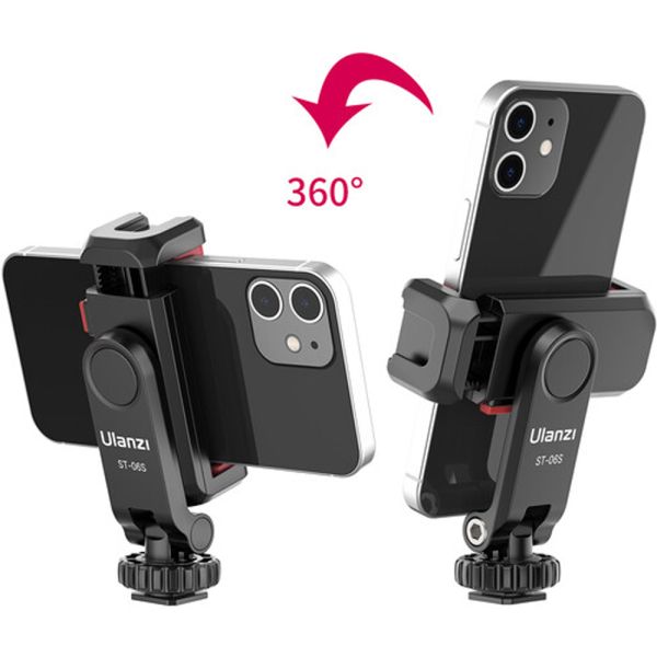 Soporte Multifuncional Ulanzi, utilice su equipo de cámara existente para tomas y filmaciones móviles con este soporte multifunción para teléfono inteligente con zapata fría ST-06S de Ulanzi. La base de este soporte para teléfono cuenta con una zapata fría con un conector integrado de 1/4", por lo que puede conectarlo a la parte superior de su cámara digital para usar su teléfono como monitor o cámara secundaria, o encima de un trípode o selfie Stick. Con la capacidad de girar 360 ° e inclinar 180 °, puede disparar en retrato u paisaje en el ángulo preciso que necesita. El soporte funciona con la mayoría de los teléfonos inteligentes y utiliza un sistema de trinquete para facilitar la instalación y extracción del teléfono. Cuando está en orientación vertical, puede usar la zapata fría incorporada en la parte superior del soporte del teléfono para un accesorio opcional, como un micrófono externo o un iluminador LED. Cuando está en orientación horizontal, obtiene acceso a una segunda zapata fría integrada en la parte inferior del soporte del teléfono. Con el ST-06S no hay que luchar con la carga del resorte ni ajustar la perilla que consume mucho tiempo. Simplemente presione el botón y abra la abrazadera, inserte su teléfono y luego empújelo para cerrarlo. El sistema de trinquete le permite lograr rápidamente un agarre firme en su teléfono.