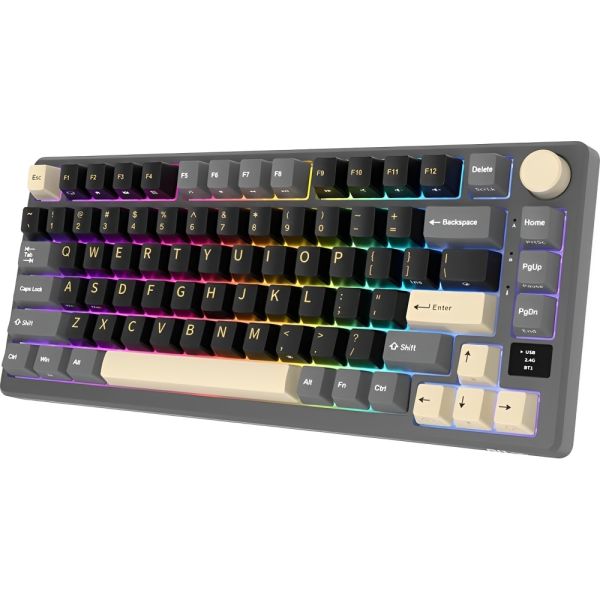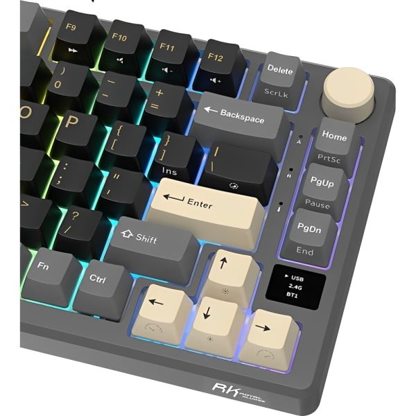 Descubre la combinación perfecta de funcionalidad y estilo con el Teclado Mecánico Royal Kludge RKM75 75% RGB Inalámbrico. Este teclado ofrece un diseño compacto al 75% con 81 teclas, optimizando el espacio en tu escritorio mientras mantiene la funcionalidad completa. Su estructura de montaje con junta proporciona una experiencia de escritura suave, ideal para sesiones intensivas de juego o largas jornadas laborales. Con una pantalla inteligente OLED, el teclado te permite monitorear los niveles de batería y modos de conexión, agregando una perilla giratoria para un control total sobre el volumen y los dispositivos conectados. La conectividad de triple modo, compatible con USB-C, inalámbrico de 2,4 GHz y Bluetooth 5.1, permite la conexión simultánea de hasta tres dispositivos, ideal para usuarios de Windows y Mac que buscan flexibilidad. Las teclas PBT de doble inyección ofrecen durabilidad superior y resistencia al desgaste y la retroiluminación RGB orientada al sur mejora la experiencia visual. Además, con opciones de interruptores intercambiables en caliente, puedes personalizar fácilmente tu experiencia de escritura sin soldaduras, adaptando el teclado a tus preferencias únicas. Este teclado es la elección perfecta para quienes buscan rendimiento y personalización máxima.Características principales: