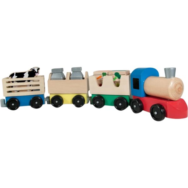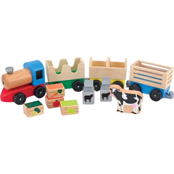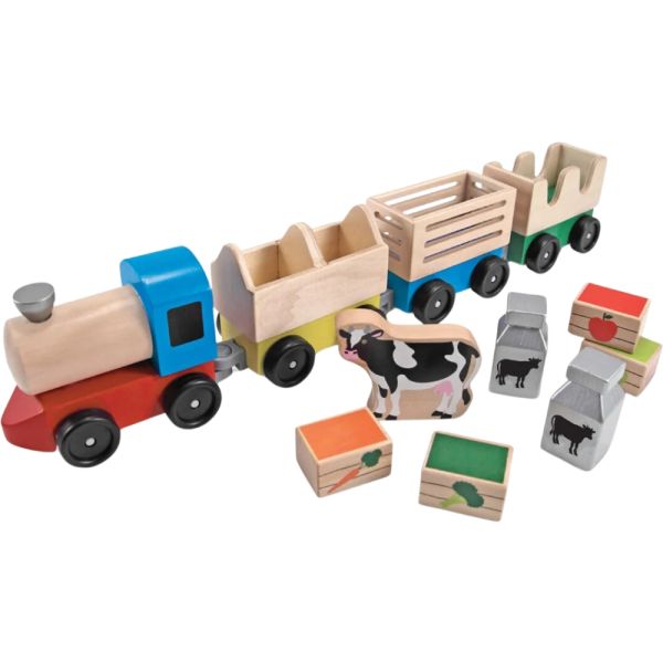 Tren Agrícola de Madera Melissa & Doug 4545, diseñado para niños de 3 años en adelante. Con un motor colorido y tres coches intercambiables, este set transporta una vaca o lleva latas de leche, cajas de frutas y verduras al mercado. Este juguete no solo ofrece diversión, sino que también es educativo, proporcionando aprendizaje sobre trenes, animales, granjas, contar, ruedas y colores.